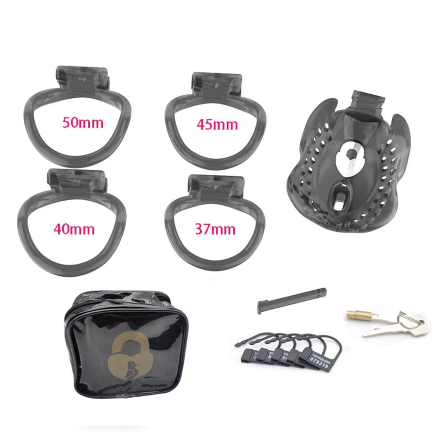 Doe één van de vier meegeleverde ringen achter de ballen, schuif de schede over de penis en sluit de kooi daarna naar wens af met het cylinderslot of met een van de genummerde plastic zegels en de pin.