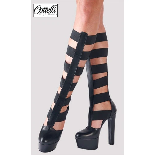 Kniehoge laars met brede geweven rubberen bandjes en split-platform. Achterzijde voorzien van rits. Zwart.