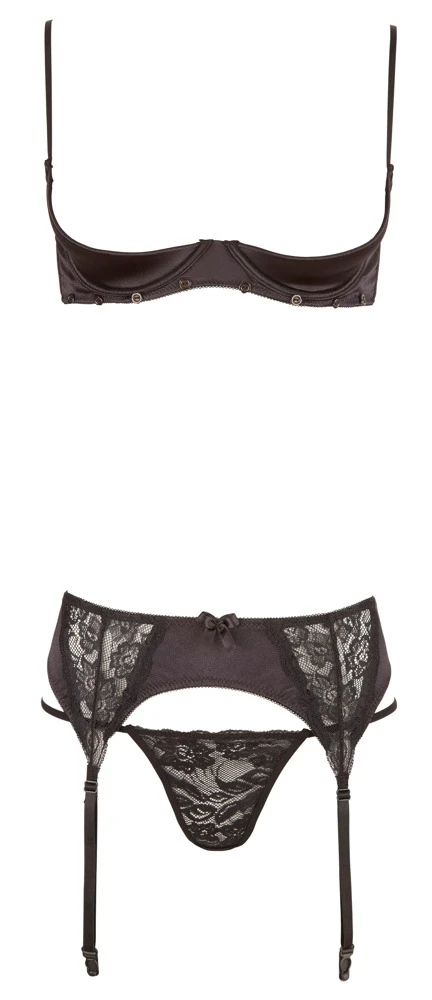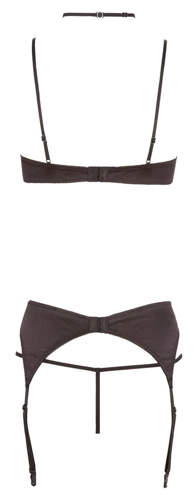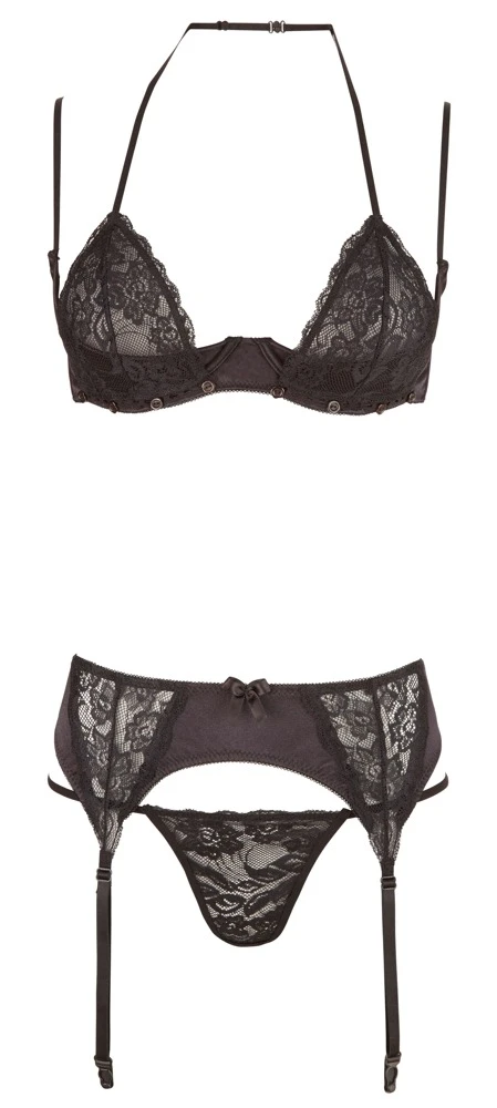 BH met afneembare kanten cups, verstelabre bandjes en afneembare halternek. De lichtgevoerde beugel bh cups zijn voorzien van een haaksluiting aan de achterkant. De jarretelgordel, compleet met 4 verstelbare jarretels is tevens voorzien van een haaksluiting aan de achterzijde. Inclusief kanten string.