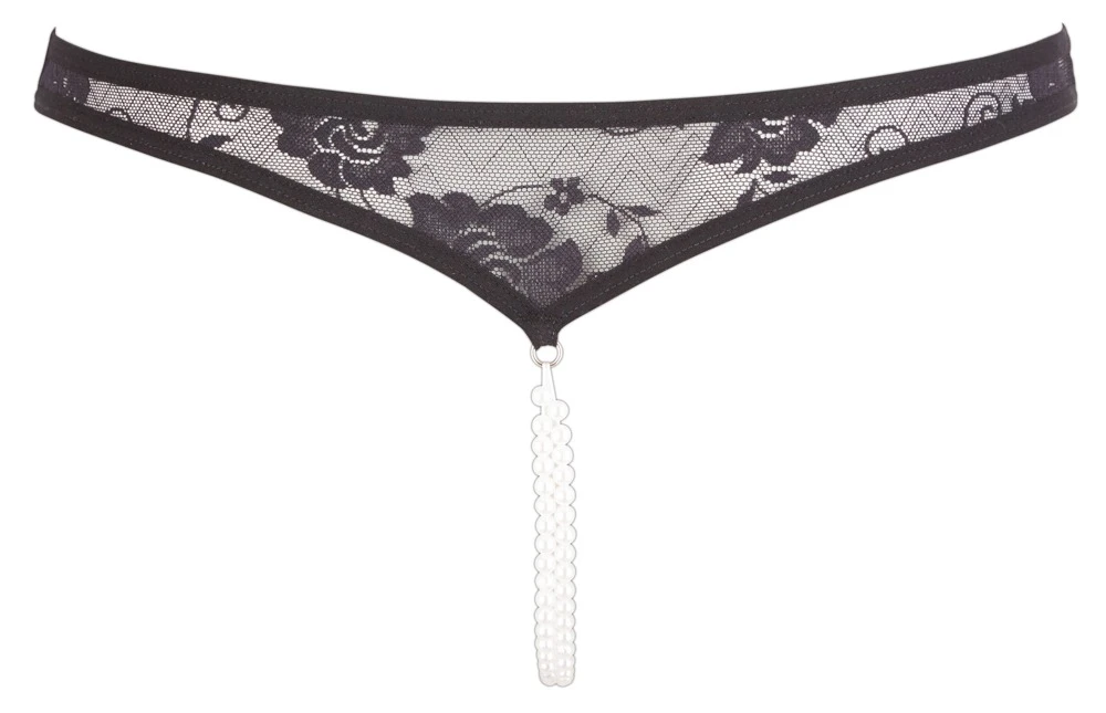 Delicate string made out of floral lace with two pearl chains over the open crotch. Very stretchy and a perfect fit.