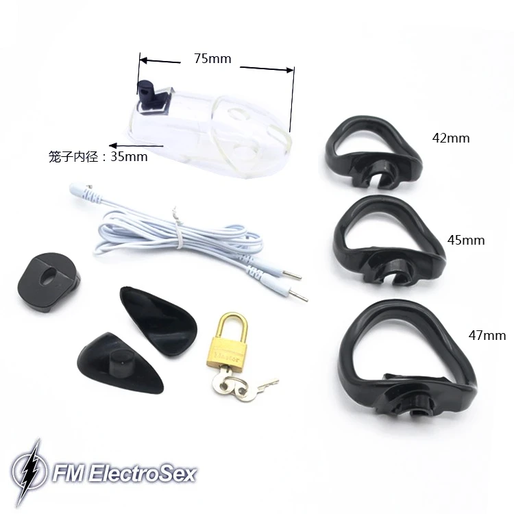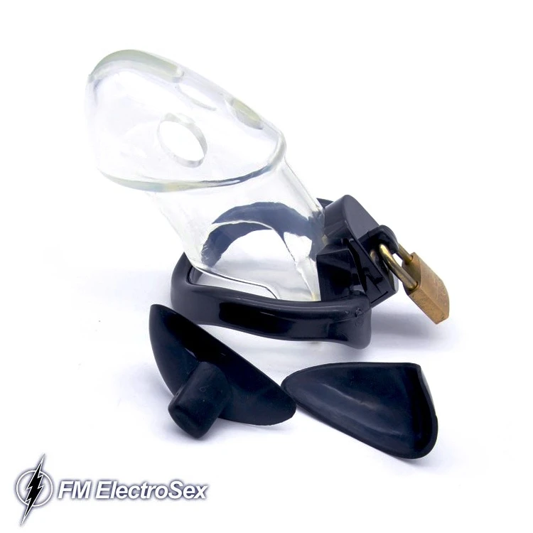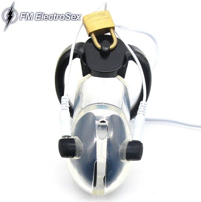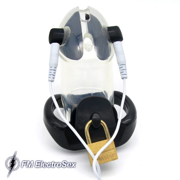 Als de afsluitbare, transparante kuisheidskooi niet straffend genoeg is kun je de afneembare electrodes aan je favourite powerbox verbinden en de vonken zien vliegen! Een uiterst complete set met alles wat je nodig hebt om jouw electro chastity ervaring perfect te maken!