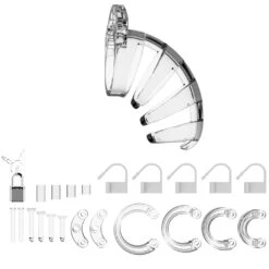 Verken je kuisheidsfantasieën met een uniek apparaat voor je plezier en amusement! Knijp de penis en ballen van je onderdanige in de basisring en schuif de rest van zijn penis door de andere vier ringen. Als hij een erectie krijgt, zullen de ringen er strak tegenaan liggen, waardoor hij pijnlijk voor je plezier wordt ingeperkt.