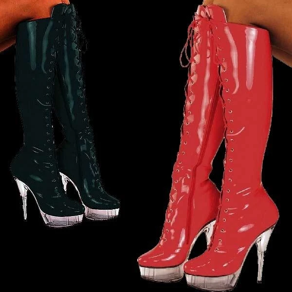 Kniehoge plateaulaarzen met doorzichtige, hoge zolen. Aan de binnenzijde bevinden zich de ritsslutitingen.