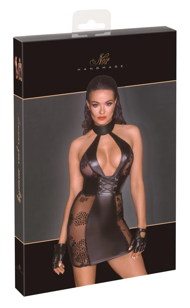 Een kort, nauwsluitend jurkje van Noir met een halternek choker. Er is een grote uitsparing in het decolleté en daaronder een vetersluiting die de taille benadrukt. De bovenkant van de rug is onbedekt. Aan de onderkant van de rug zit een rits zodat hij makkelijk aan en uit te trekken is. De jurk is gemaakt van stijlvol materiaal met een matte look en aan de zijkanten zit transparant materiaal dat is bedekt met een fluwelen flockprint. Het transparante materiaal vormt zich naar het lichaam en voelt zeer comfortabel aan om te dragen.