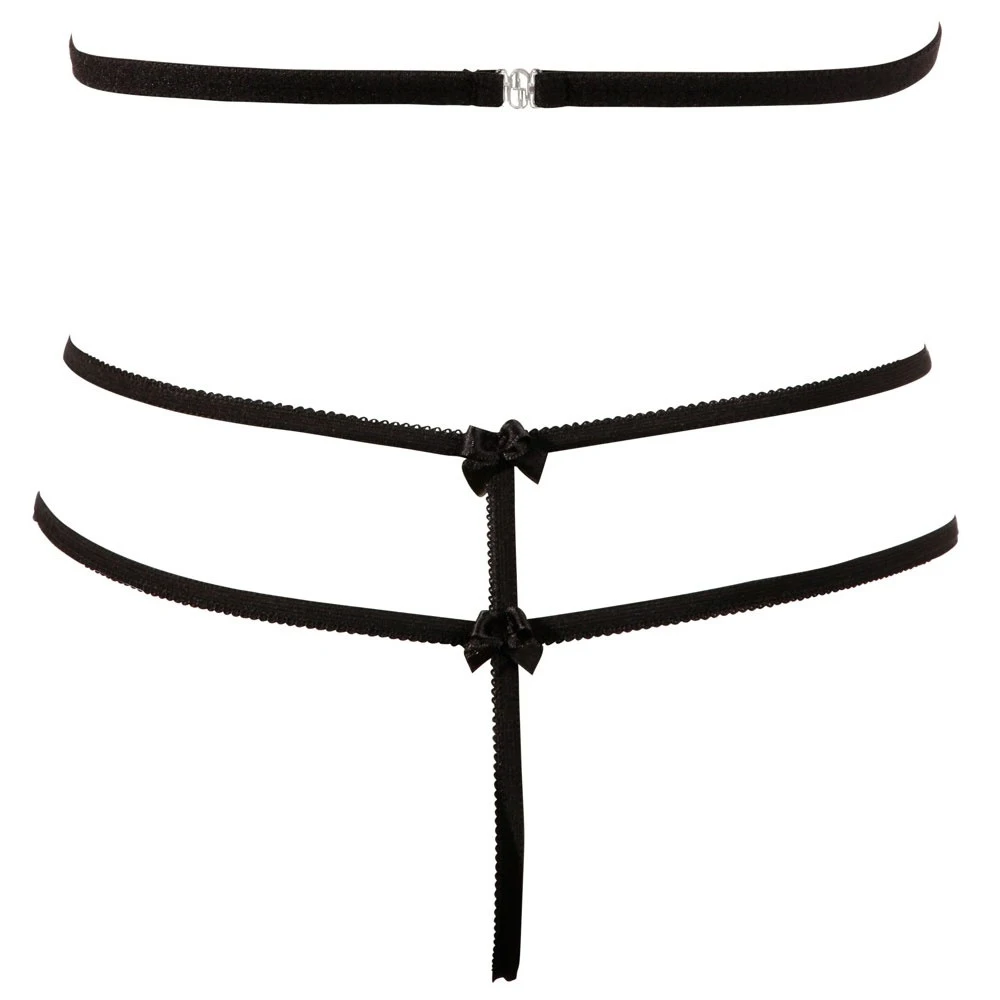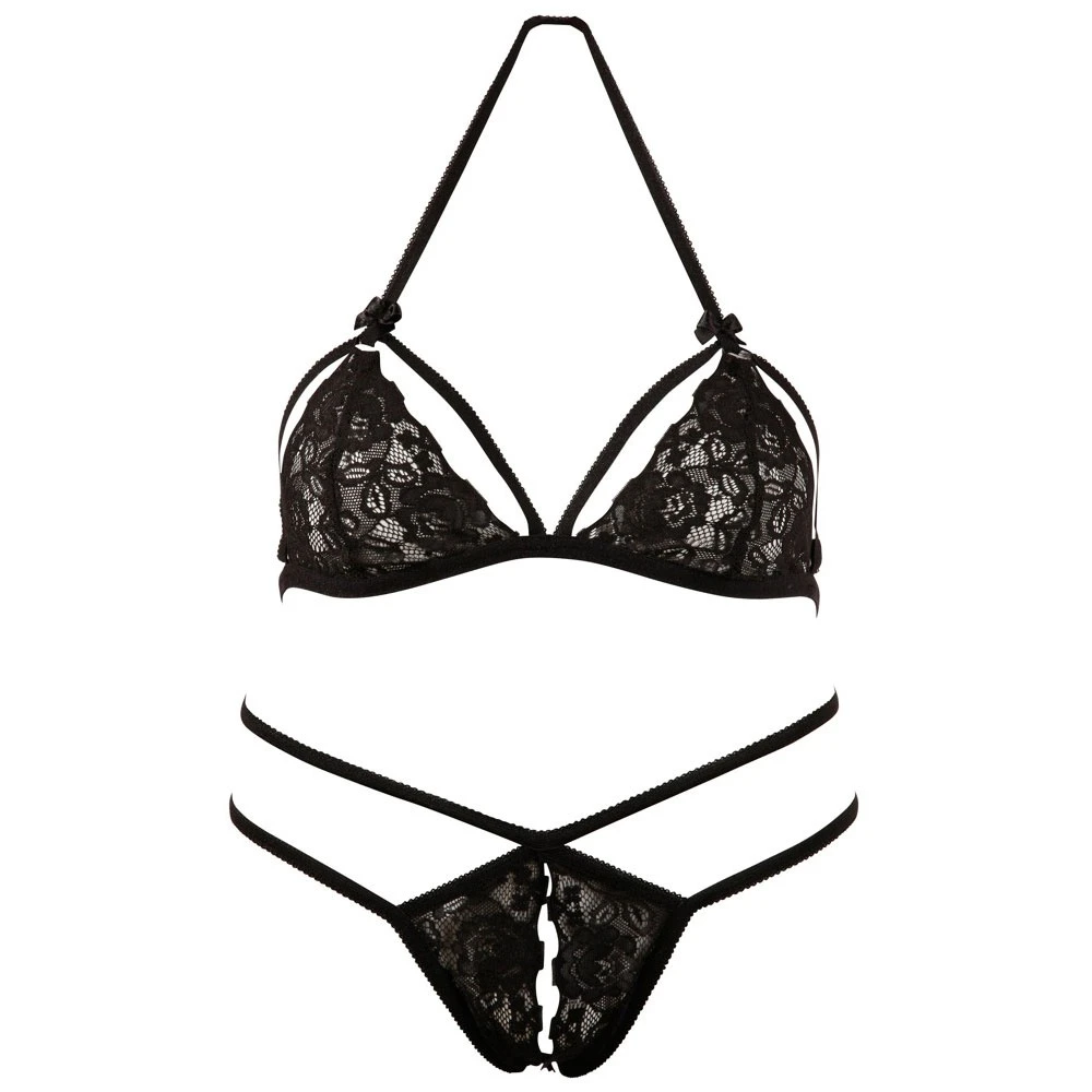 Zachte beha met haltersluiting en ingenieuze kleppen. String in effectief ontwerp, met een dubbele tailleband en een open kruis! Zwart. 100% polyamide