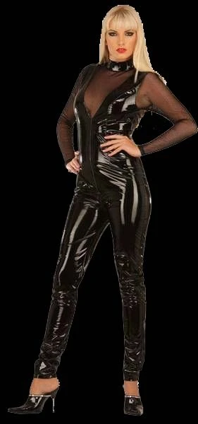 Lak catsuit met netstof mouwen en netstof decollete. Met doorlopende rits door het kruis.