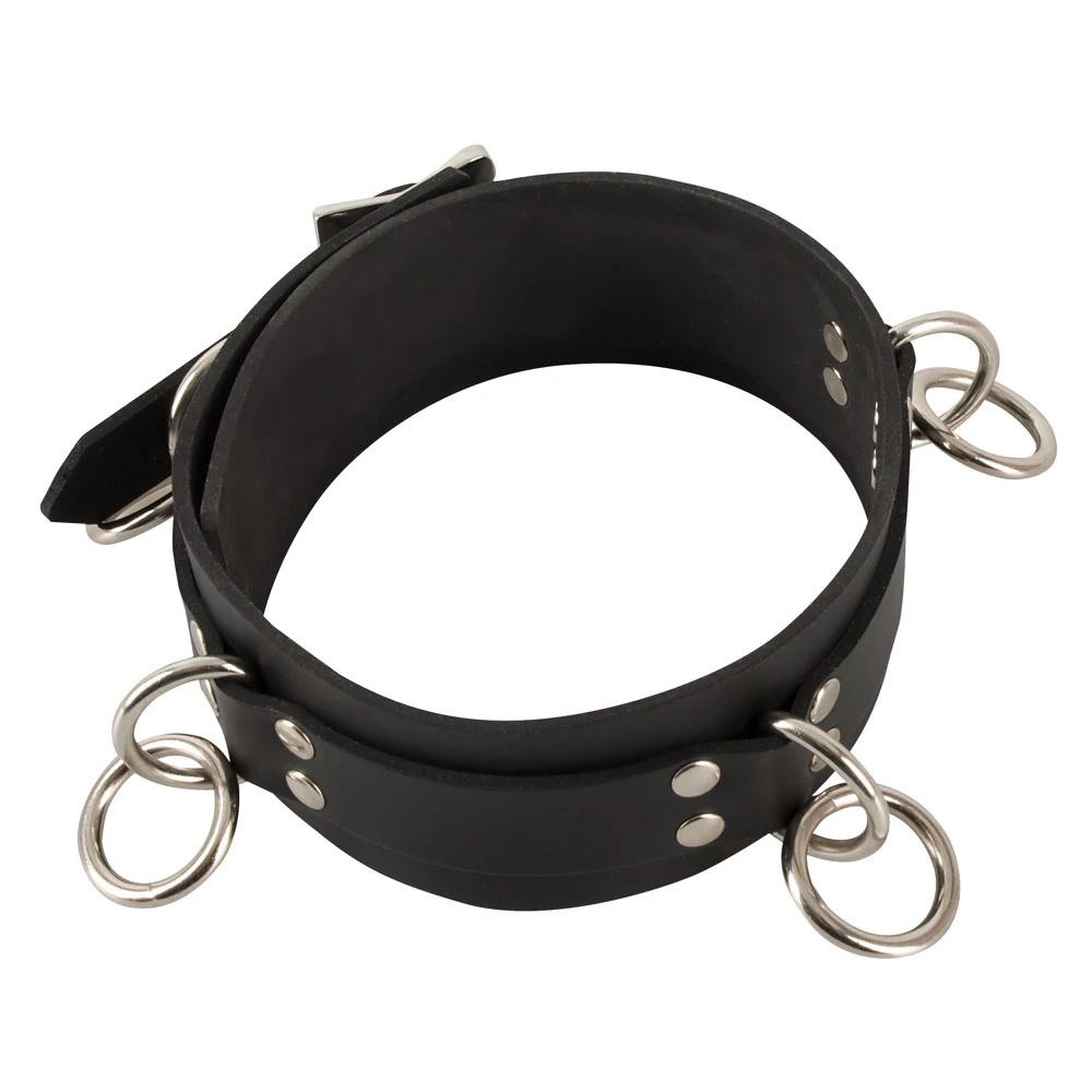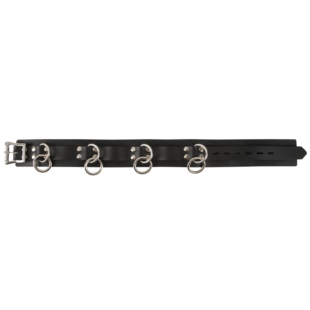 Hét perfecte dark room accessoire voor bondage sessies: Zwarte 5cm brede volledig latex halsband met 4 robuuste stalen dubbele ringen. Met verstelbare en afsluitbare gesp.