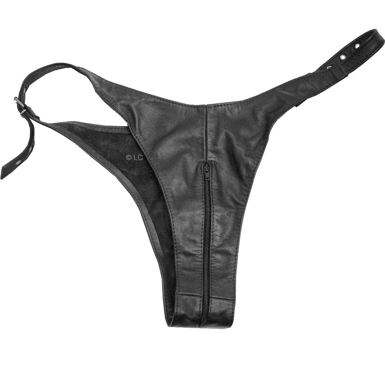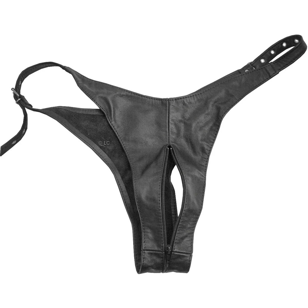 Adjustable leather slip. Leather slip open, crotchless, with built-in zipper in the crotch.
