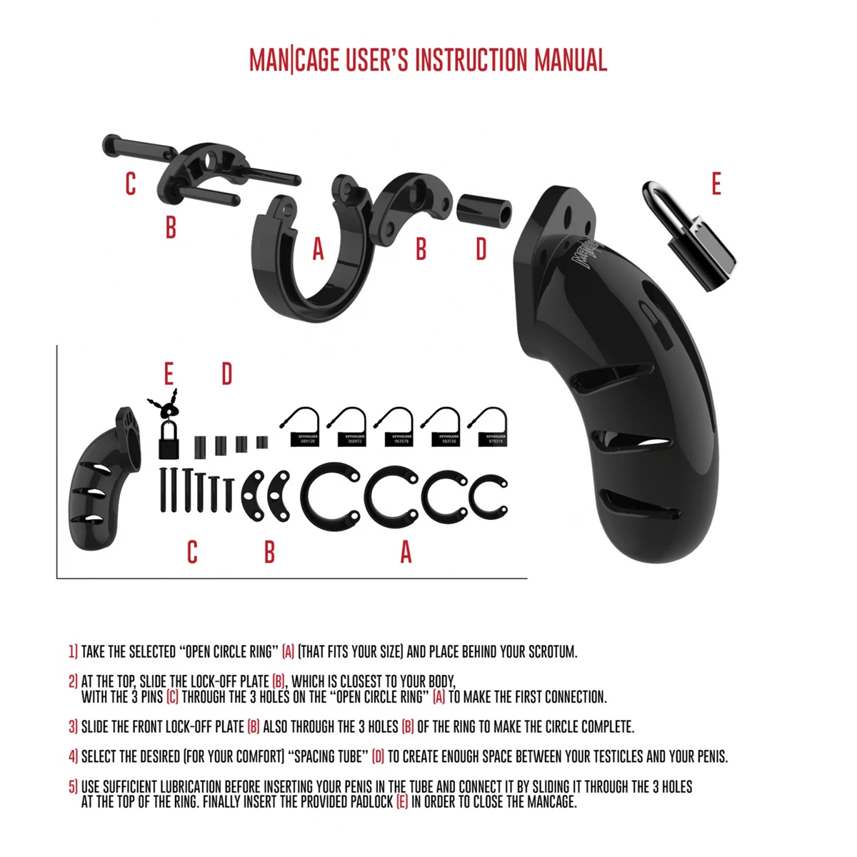 De Man|Cage Chastity Cages zijn gemaakt van polycarbonaat van hoge kwaliteit, en dat is een zeer licht, duurzaam en hypoallergeen materiaal. De kooi bestaat uit drie delen die perfect op elkaar aansluiten. De twee geleide pennen sluiten de bovendelen aan, en de ovale borgpen sluit de ringen op de kooi aan.