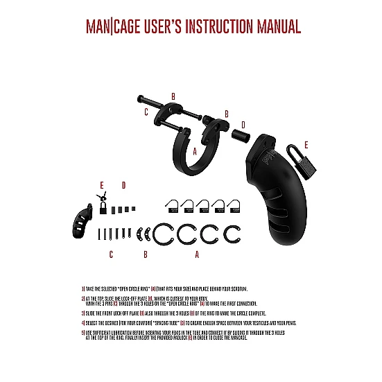Er zijn vijf verschillende ringen en verschillende afstandhouders om het perfect te meten. Het heeft functionele openingen voor ventilatie en toiletgang en is gemakkelijk schoon te maken. Deze Mancage wordt geleverd met verschillende plastic sluitingen, die kunnen worden gebruikt als extra discretie vereist is (zoals veiligheidscontroles). Deze sloten kunnen worden losgemaakt wanneer het tijd is voor de ultieme ontgrendeling. Er wordt ook een stevig metalen slot meegeleverd.