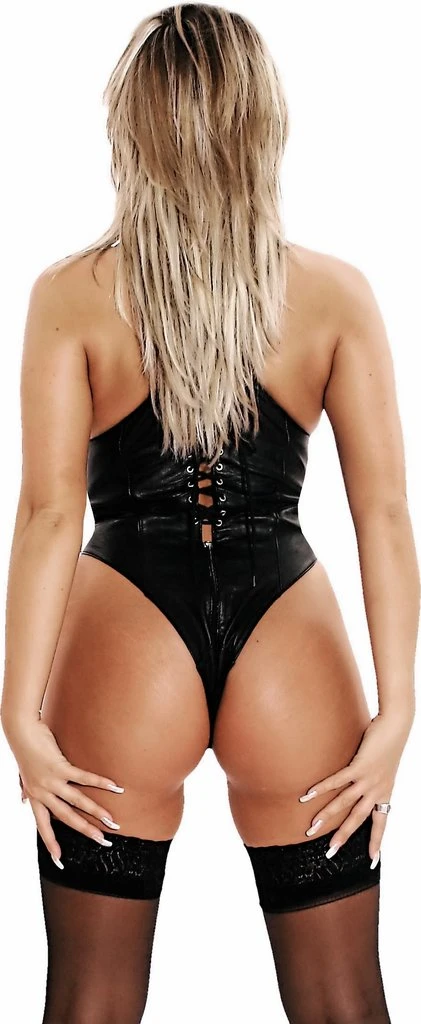 Two-toneleather body, lacingon thefront andrear.High-cut legsandadjustable straps.Zipper runsfromtheGulfthrough the crotch. The leatherfrontbody consistsof two parts.Thefirst part is theentirebody withzipper andstrapto adjust.The secondpart:a bodiceinthered,sewed upthe sides, forenabling /lacefront. Due-color body with laced clasps on front back.
