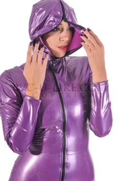 Kinky PVC catsuit voor dames met bevestigde volledig sluitbare capuchon en rits over de gehele lengte. De dubbele rits geeft u en uw partner gemakkelijk toegang tot al uw favoriete plekjes!