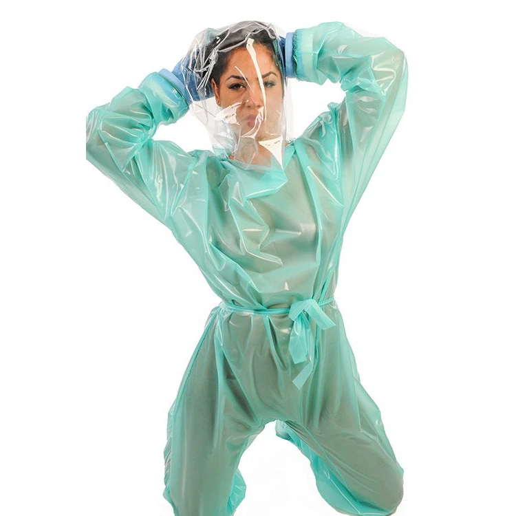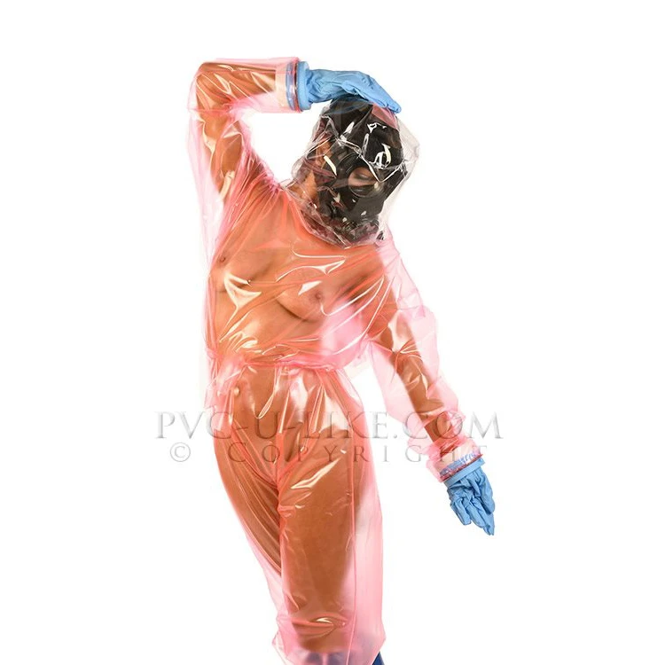 Als jezelf van top tot teen omhullen in heerlijk PVC jouw droom is is dit hét ideale pak voor jou! Dit hazchem pak heeft een kokervomige, transparante kap, rits over de gehele achterzijde en dichtingen rond de polsen inclusief blauwe nitrilrubberen handschoenen.