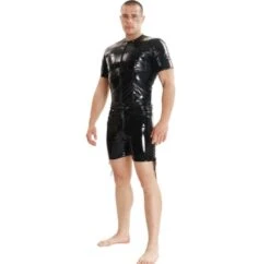 Rood PVC blouse met korte mouwen en ritssluiting aan de voorzijde en borstzakken.