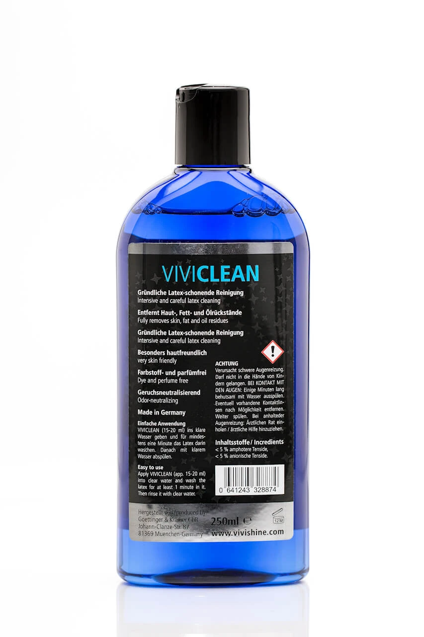 VIVICLEAN is the perfect wash lotion for latex clothing and toys with its intensive cleaning and being material-friendly. Due to its osmotic properties, moisture, dirt, odor or bacteria can settle into latex, and cleaning with a suitable agent is recommended.