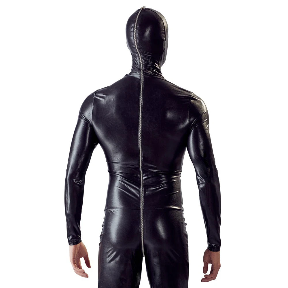 Dit volledige lichaamspak is gemaakt van glanzend, zeer elastisch materiaal, dat licht transparant is en slechts een schaduwachtige beleving van de omgeving mogelijk maakt. Het heeft oogjes voor de neus, een rits bij de mond en een 2-weg-rits, die door het kruis loopt, over de hele rug en verder naar de achterkant van het hoofd.