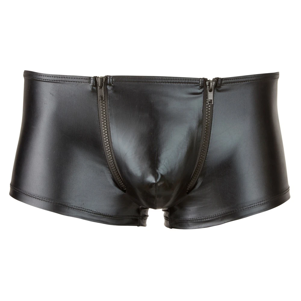 Pure verleiding! Extreem glanzend broekje met een anad die jouw achterwerk accentueert en kunststof ritsen langs de buidel voor jouw pik. Zwart, 92% polyester, 8% elasthan.