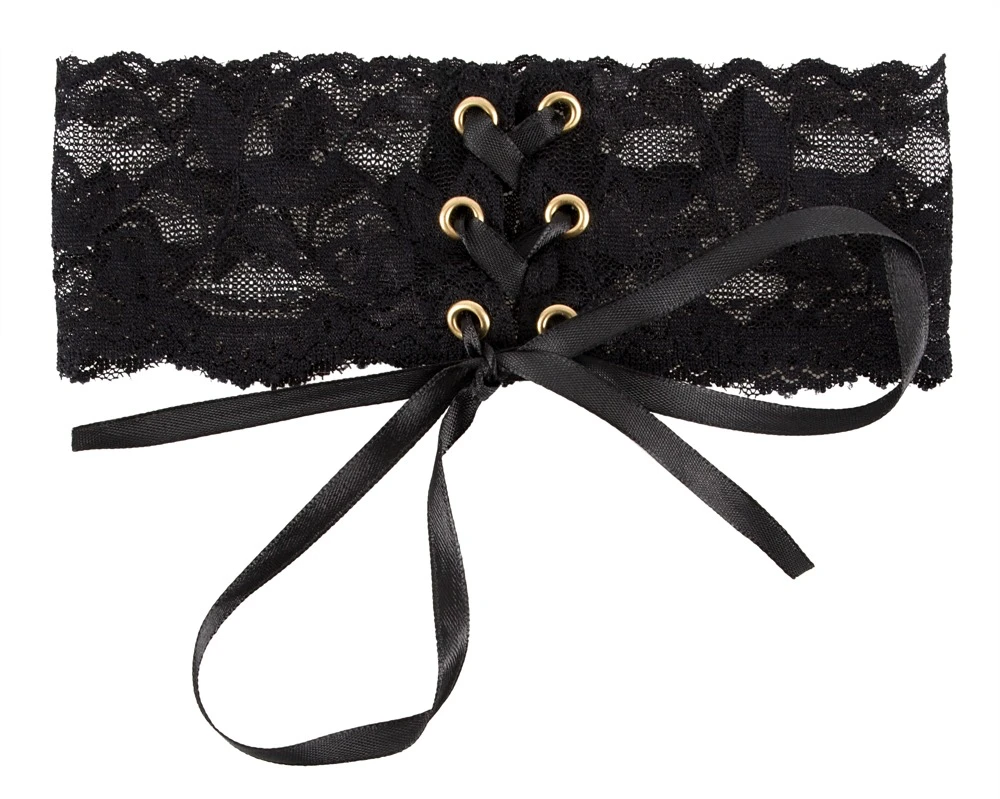 Mooie halsband van zwart kant, met 6 oogjes en satijnen lintvetersluiting voor het sluiten en aanpassen van de lengte. Sluiting kan aan de achterkant of aan de voorkant worden gedragen.