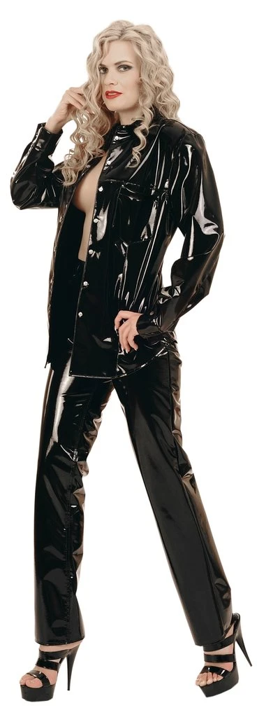 Strakzittende lak broek zonder tailleband. De broek heeft zowel voor als achter geen broekzakken.