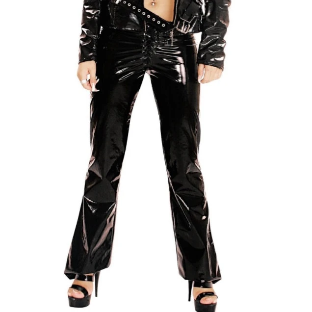 Strakke zwarte lak broek met uitlopende pijpen, zonder broekzakken.