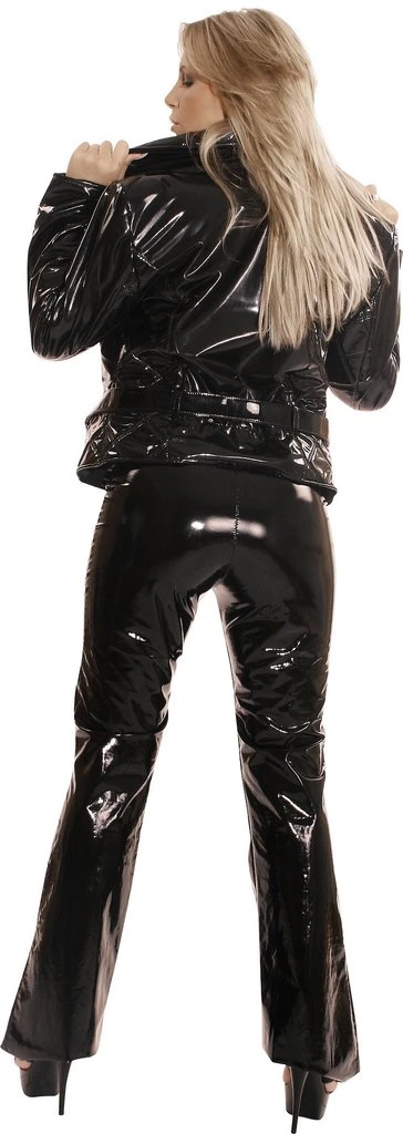Kort lakjasje met een brede kraag en een ritssluiting. Onderaan bevindt zich ook een riem om het jasje strakker aan te trekken.