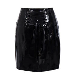Sexy glanzend zwarte lakrok met handig rits aan de achterzijde en rijgveters aan de voorkant. Veelzijdig, gemakkelijk te dragen en kinky fetisj fashion!